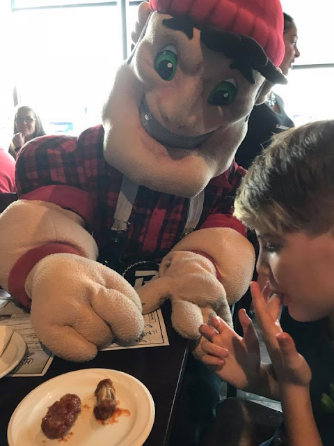 He chose the restaurant, and when we arrived it was quite busy. It turns out that a couple of players from the Ottawa Redblacks were going to be there, and doing a radio interview. This was a surprise to us, but we waited a few minutes for a table and when we were sat down, browsed the menu. A little while later, Big Joe, the Redblacks mascot came in. He made his way over to our table, and gave a high five to the kids. I mentioned it was Mr. K's birthday, so he gave him a hug and then wrote a birthday message on MR. K's menu.